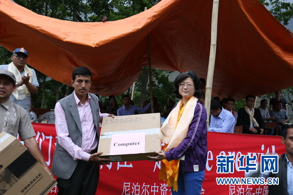 中國駐尼泊爾大使於紅(右)給學校贈送電腦。此次,中國駐尼使館一共贈送兩臺電腦、118臺收音機。新華網發