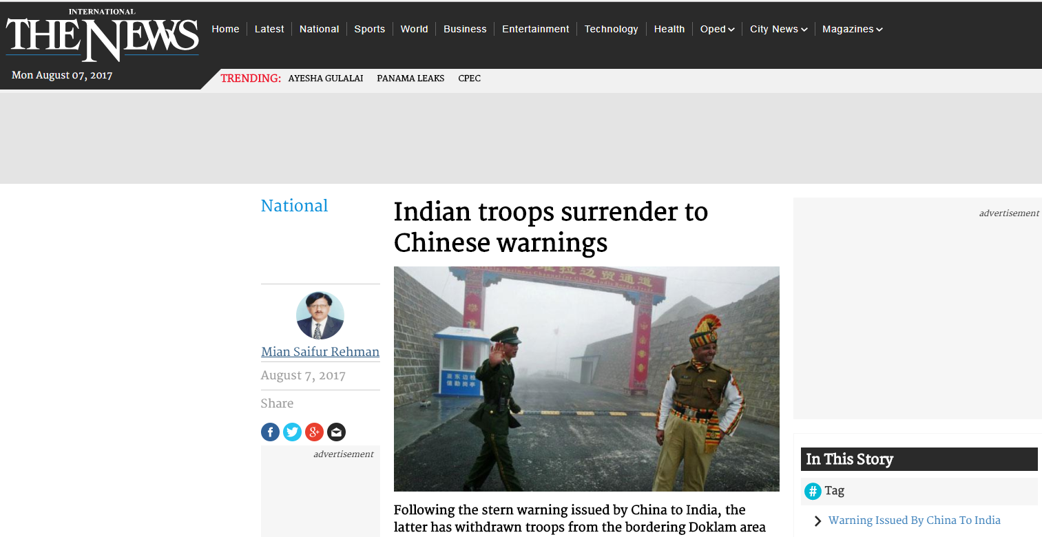 海外網8月7日電巴基斯坦《國際新聞》網站7日報道稱,據可靠消息,中國政府就印軍非法越界嚴正警告印度後,5日深夜到6日凌晨期間,印軍在洞朗地區連夜撤離,只剩下少數人留守。報道稱,這意味著印度軍隊終於向中國投降。