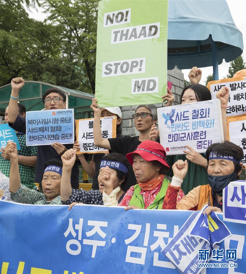 資料圖:7月31日,在韓國首爾國防部門前,韓國民眾高舉反對部署『薩德』系統的標語參加抗議集會。當日,在位於首爾的韓國國防部門前,百餘名韓國民眾振臂吶喊。來自『薩德』系統在韓部署地星州郡的居民以及各地和平人士舉行集會,反對繼續部署『薩德』剩餘裝備。新華社發(李相浩攝)
