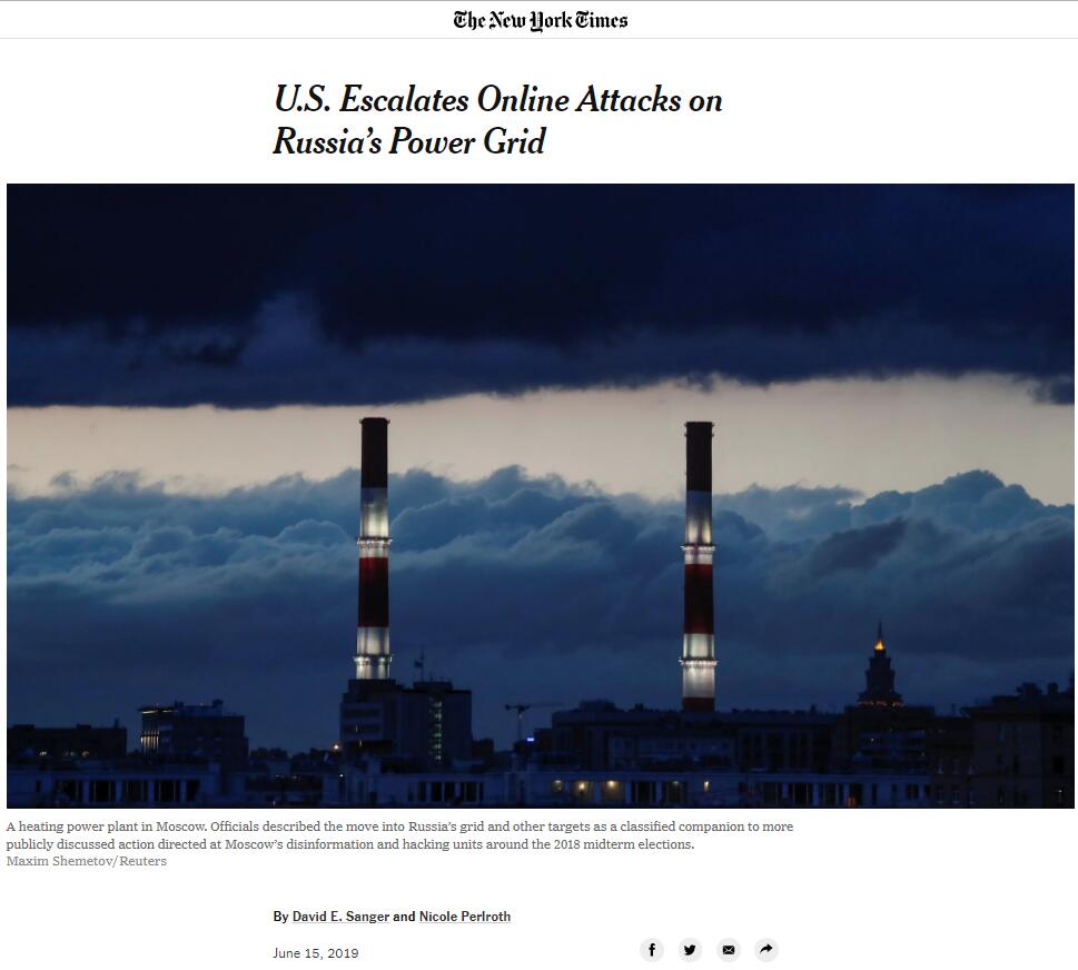 【環球網報道實習記者 溫家越】美國《紐約時報》15日曝光了一則勁爆消息:美國加大了對俄羅斯的網絡攻擊力度,並已將可能造成嚴重損害的惡意軟件植入俄羅斯電網系統內部。隨後,包括美國有線電視新聞網(CNN)、『今日俄羅斯』(RT)等多家外媒都關注此事。