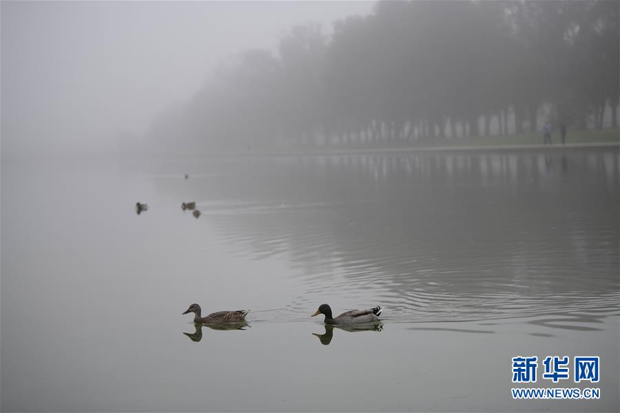 10月22日,在美國首都華盛頓,野鴨在林肯紀念堂倒影池中游弋。當日,華盛頓出現濃霧天氣,能見度較低。新華社記者劉傑攝
